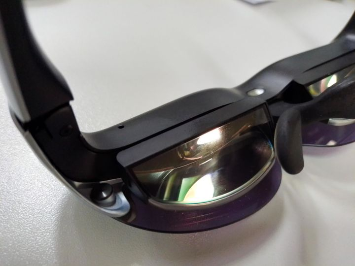 低分辨率单色的显示,终究是限制多多。比此类单色低分辨率产品显示效果好一档的,是使用更大的micro-OLED投射彩色图像,比如Rokid自家的 Rokid Air,1920*1080分辨率,官方宣传41度视场角(对角线,实际只有不到35度),使用类似墨镜的造型,用镜片上面的一块屏幕,把图像反射到眼睛里,这样显示效果提升了,但是眼镜也厚重了一些。Air的宣传重量是83克,比49克的Rokid glasses 重了几乎一倍。 这类眼镜主要的使用场景是随身屏幕,连接手机后当做外接显示器,可以用来打游戏。 因为视场角的限制,效果远达不到VR沉浸式体验,差不多就是一块大一点的pad。