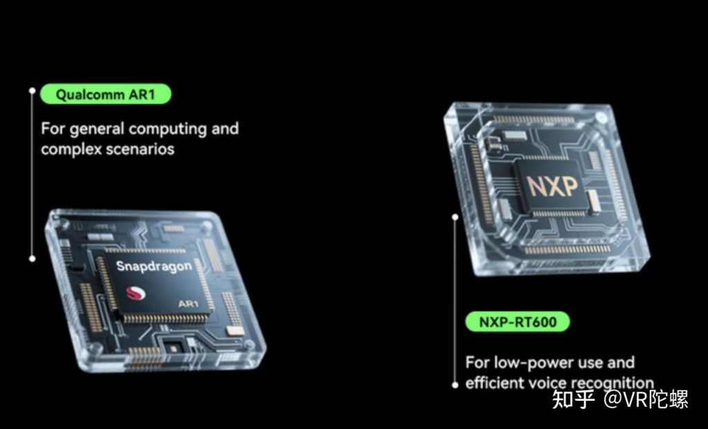 高通抢先统治了这个市场,后来者也不是完全没有机会,苹果就可以另起一行。苹果给Vision Pro搞了两颗芯片的方案, 一颗来源于苹果笔记本/手机的处理器,另外一颗单独负责空间计算。 在轻量级AR领域, Rokid glasses 之所以在严控重量下还能保持相当的续航能力, 也是因为在高通的处理器之外,引入了一颗恩智浦的MCU当协处理器。 这颗处理器能力不强,但是功耗很低,可以在不唤醒主处理器的情况下,处理一些例如语音唤醒词识别之类的待机任务。